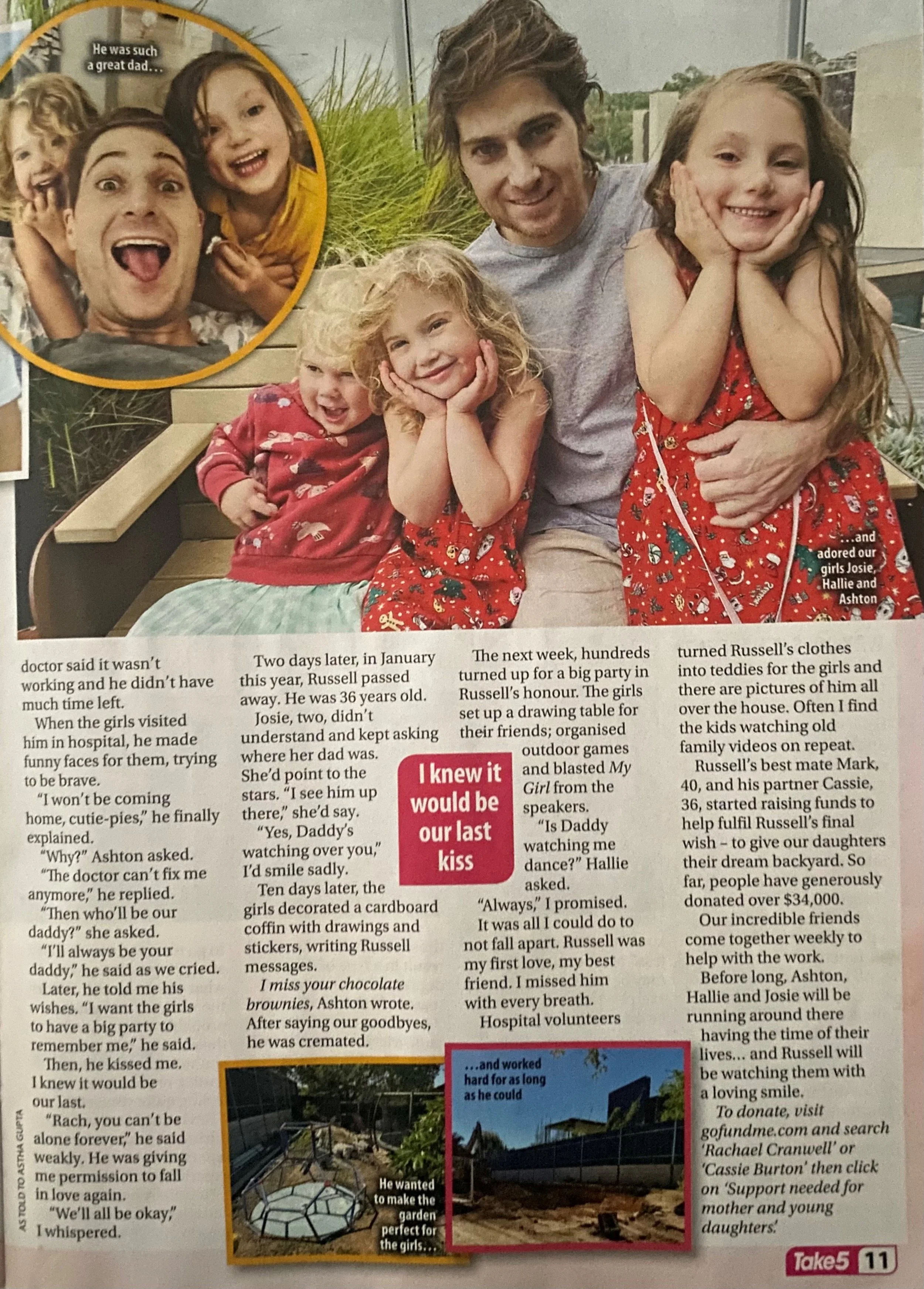 yahoo!newsMates rally to help fulfil Aussie dad's last backyard wish 7news.com.auCommunity rallies to finish young Adelaide dad’s ‘dream’ project for his surviving wife and children The AdvertiserRussell Cranwell, 36, dies after bowel cancer battle gofundmeSupport needed to mother and young daughters kidspotDrs thought Dad’s pain was caused by a parasite - the reality was much worse